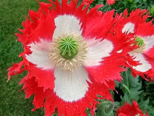 This variety has intensely red petals with fringed edges and in the middle a white colored cross has been delicately laid bare by mother nature, which gives it its common name Danish flag.