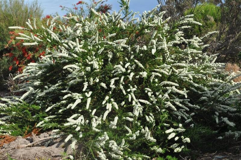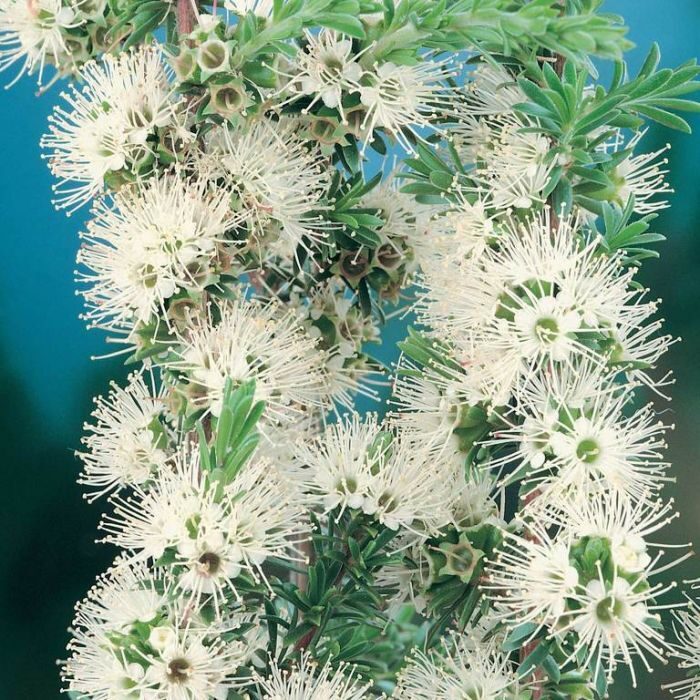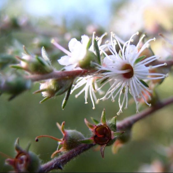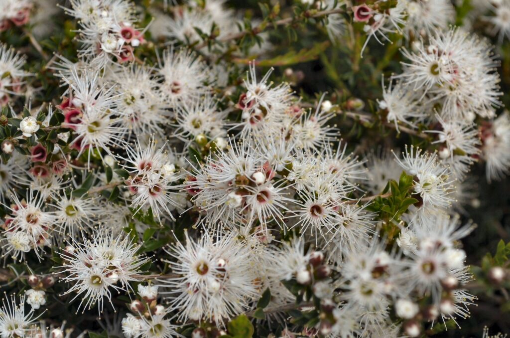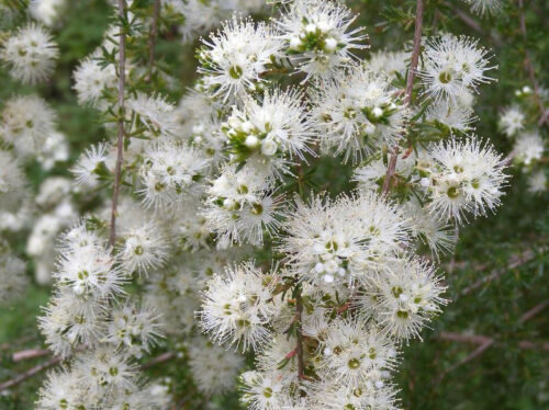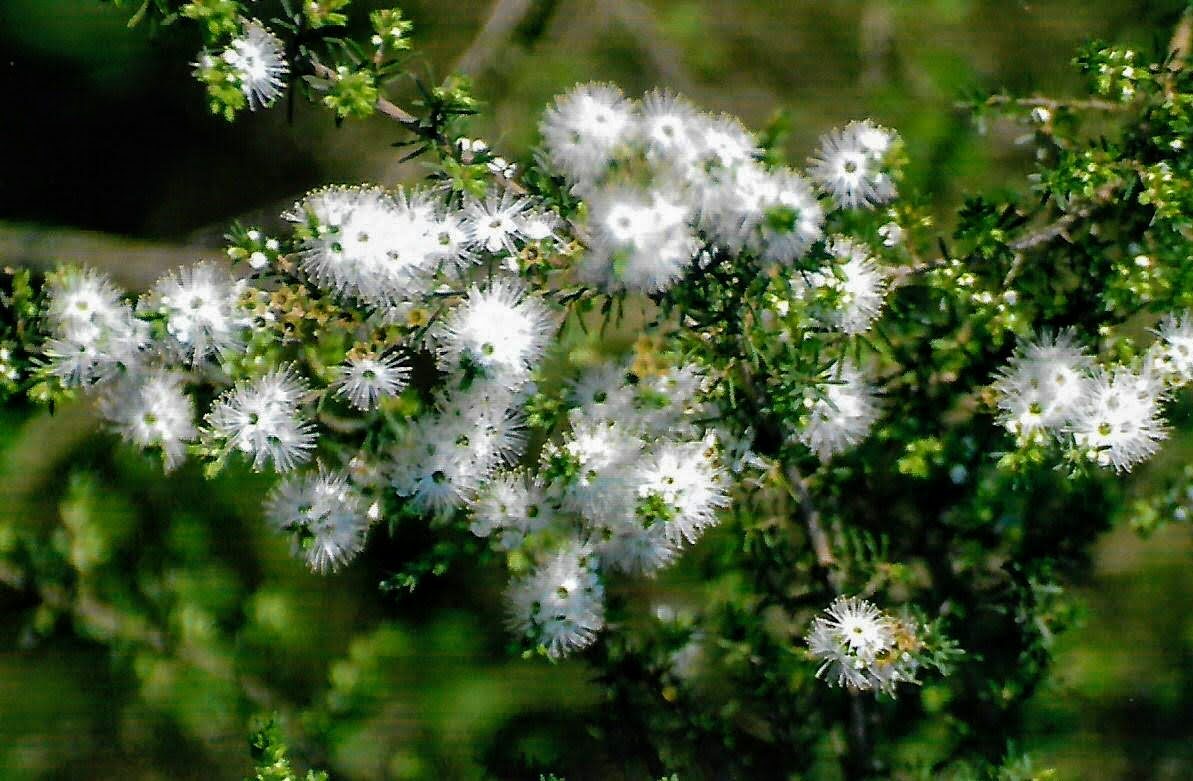 A spreading shrub rarely more than 3 m tall, native to the coastal areas of southeastern Australia, with arching branches covered by fibrous bark, small, narrow, densely arranged leaves and clusters of beautiful starry, cream colored flowers with an intense honey scent, followed by leathery seed pods. Kunzea ambigua is also the source of a special oil, used in aroma-therapy. A beautiful, low maintenance ornamental for warm-temperate climates, in USDA Zones 9 and above.