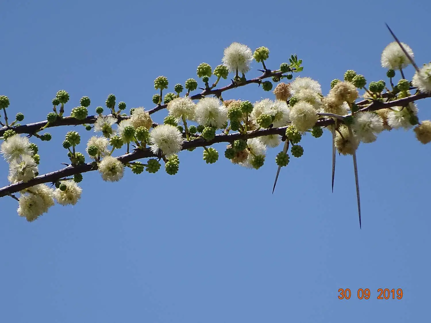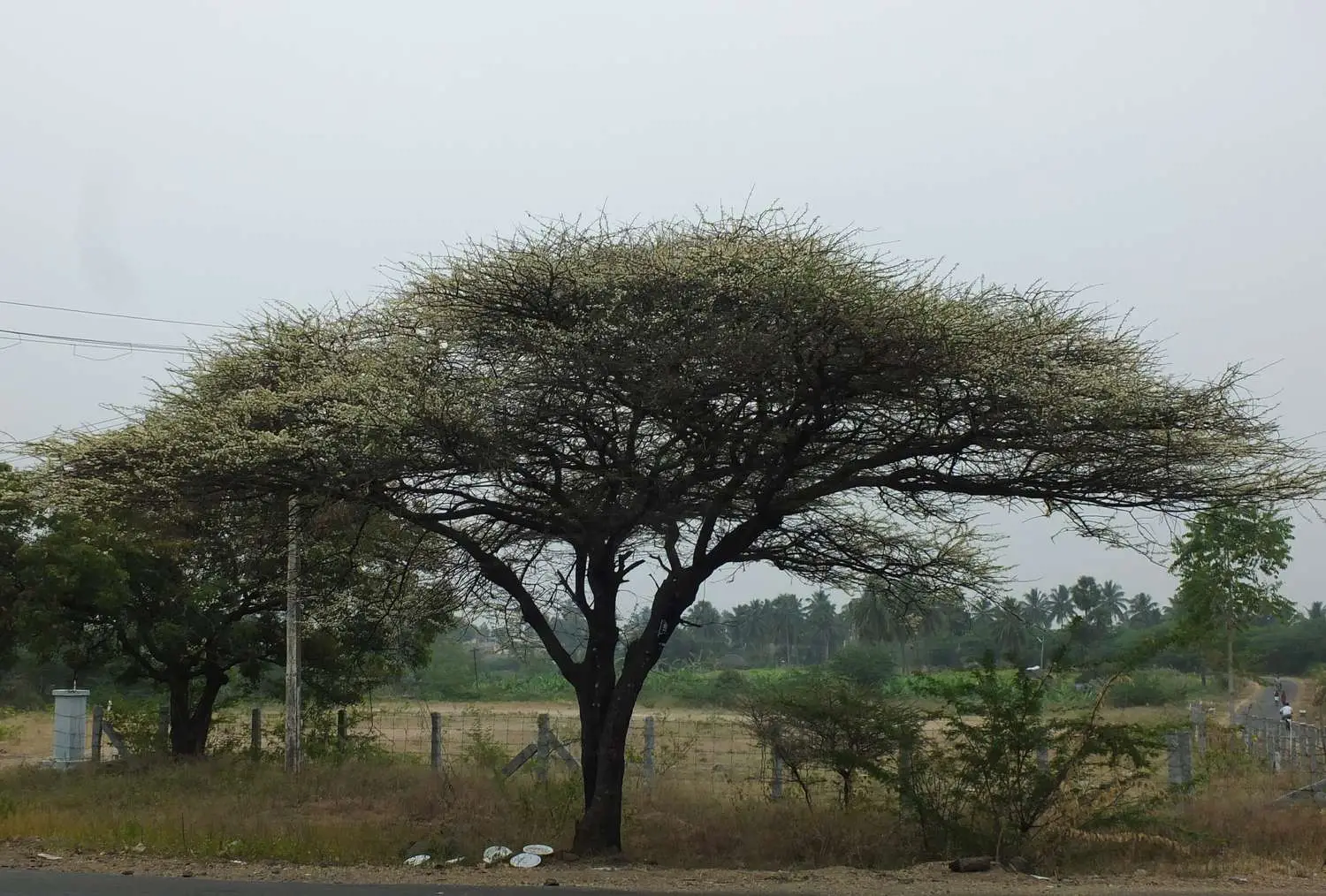The umbrella thorn (Acacia planifrons) is a species of acacia in the Fabaceae family. She is from India and Sri Lanka. It is a thorny bush about 7 m high. The grayish-brown bark is thick with horizontal markings. The leaves are bipinnate, alternate; Blunt tip; Whole border. The flowers are white. Flowering period: October-April.