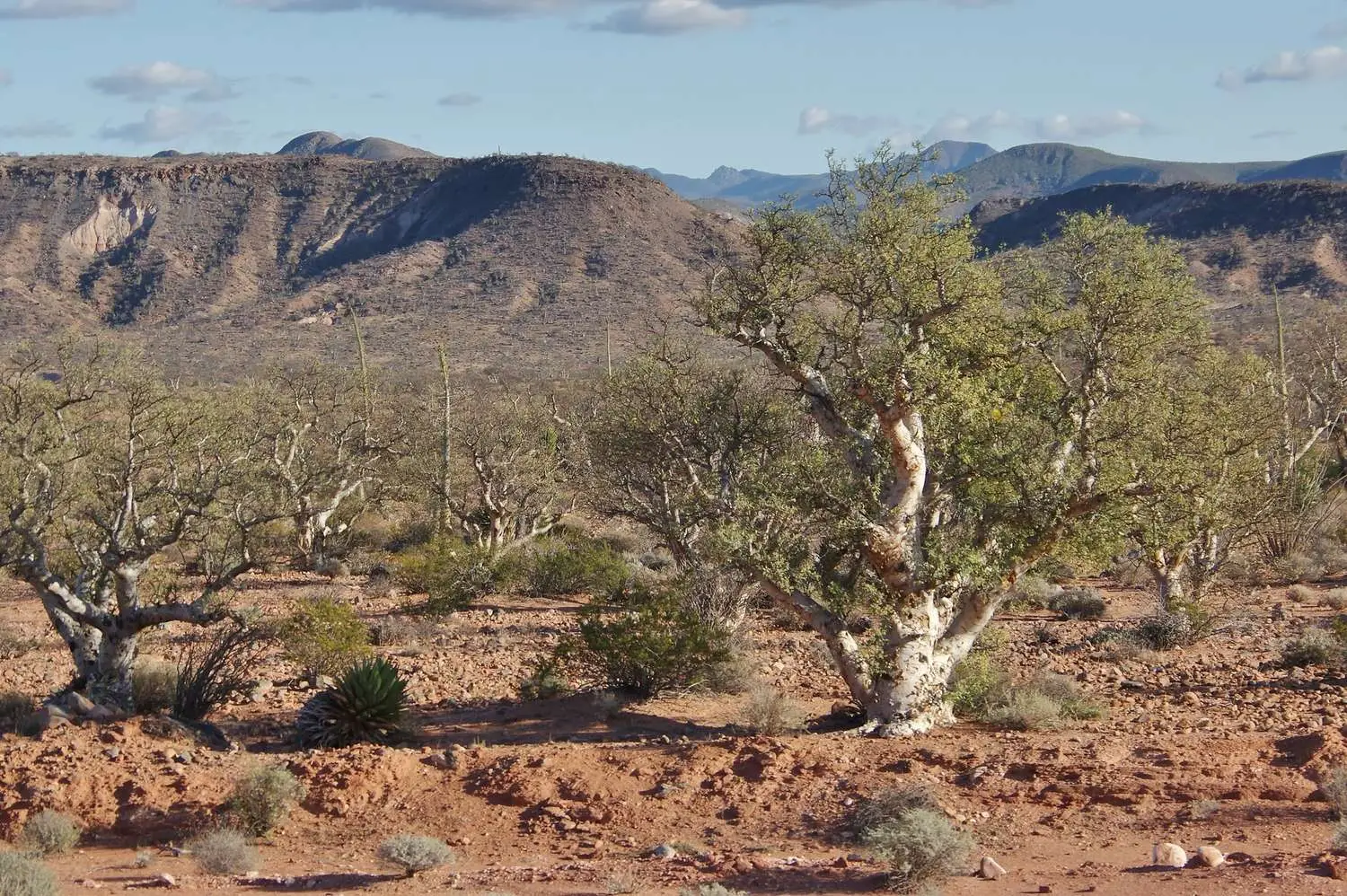 Pachycormus discolor, commonly known as the Baja Elephant Tree, is a unique, slow-growing, succulent shrub or small tree native to the Baja California peninsula of Mexico. It is a striking plant valued for its thick, gnarled trunk and branches, which are covered in a smooth, papery, exfoliating bark that peels away to reveal a greenish, photosynthetic layer beneath.