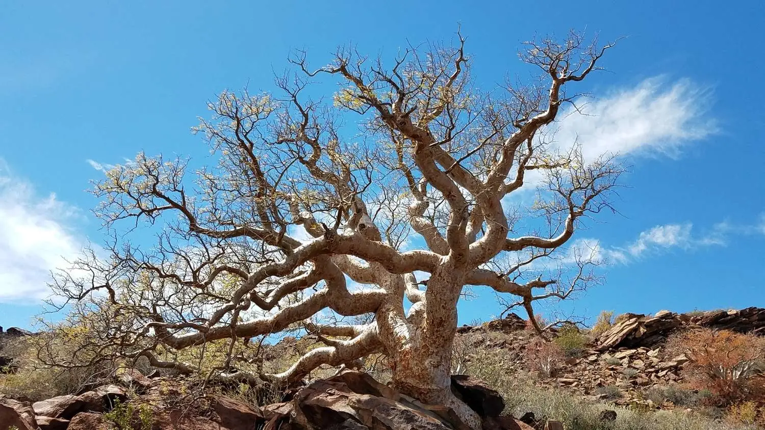 The leaves are small, pinnately compound, and drought-deciduous, meaning they fall off during the dry, hot summer to conserve water. This is when the tree’s interesting form and pale bark become the focal point. It produces panicles of small, creamy-white to pink flowers, and its overall appearance is often described as resembling an overgrown bonsai. It is a sought-after plant for collectors of rare and unusual succulents.