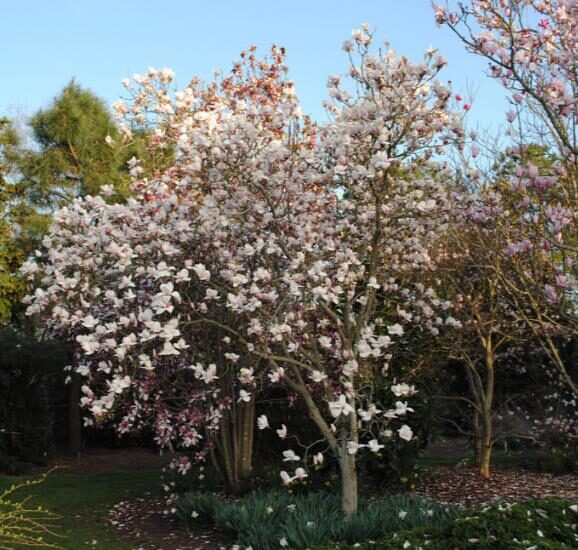 Magnolia borealis blooms in early spring having white flowers with pale pink notes and are pleasantly scented.