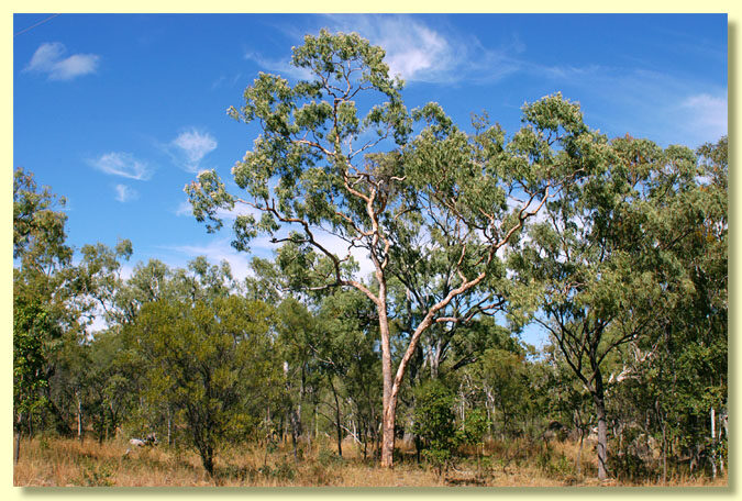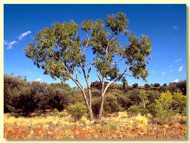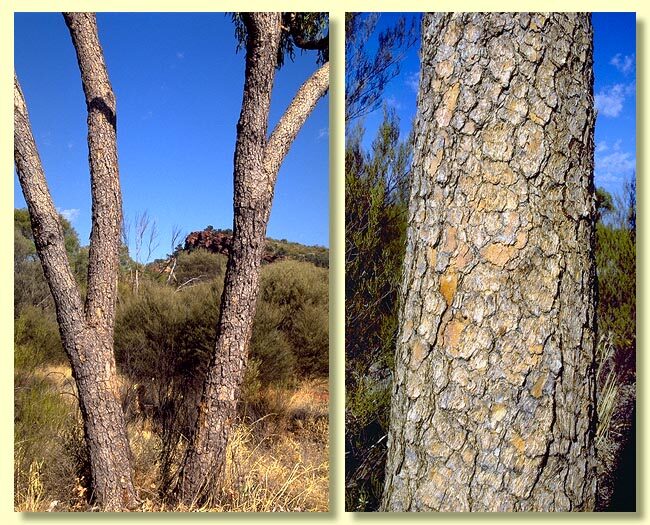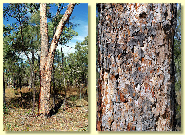 Bark rough on part or all of trunk, sometimes extending to the larger branches but not uncommonly on lower trunk only, tessellated, light brown to light grey or, where flakes have recently shed, reddish, pink or orange; bark of larger limbs may be rough or smooth; smooth bark whitish or cream.