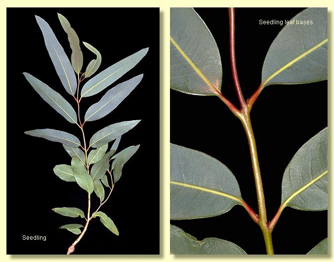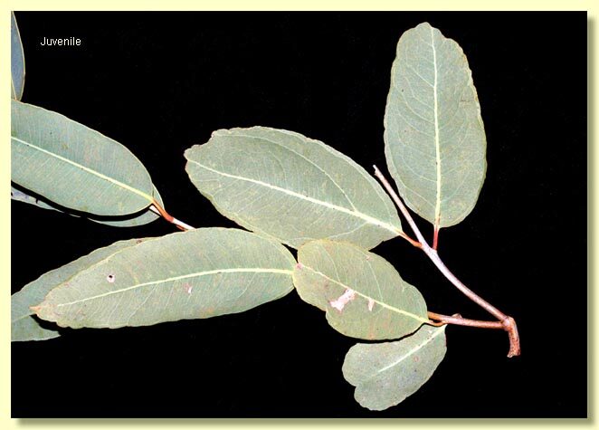 Adult leaves alternate, petiole 1–3 cm long; blade lanceolate, 8–20 cm long, 1.2–3 cm wide, base usually tapering to petiole, concolorous, slightly glossy or dull, pale green to yellowish green, strongly penniveined, very densely reticulate, intramarginal vein absent, oil glands few and island, or absent.