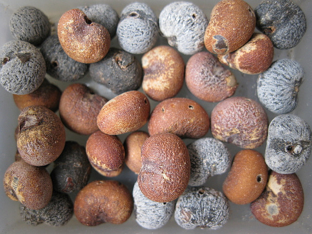 Flowering occurs in both the dry and the wet season. Buds are rounded with a cone-shaped tip. Flowers are showy and sometimes paired, but usually produced singly at the end of a 15-90 cm long hanging stalk. The calyx is typically made up of 5 (sometimes 3) green triangular bent-back lobes (sepals) with a cream-coloured, hairy interior. The petals are white, roughly the same width and length – up to 8 cm, and are crumpled in bud. Flowers open during the late afternoon, staying open and fertile for only one night. The fresh flowers have a sweet scent, but after about 24 hours, they start to turn brown and emit a carrion smell. The androecium is white and made up of a 3-6 cm long tube of fused stamens (a staminal tube) surrounded by unfused (free) filaments 3–5 cm long. There are a large number of stamens, 720-1600 per flower. Styles are white, growing through the staminal tube and projecting beyond it. They are usually bent at right-angles and topped with an irregular stigma. Pollen grains are spherical with spikes over the surface, typical of the Malvaceae family. Pollen grain diameter is around 50 microns.