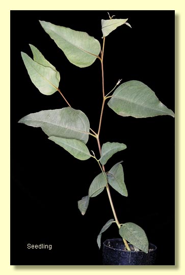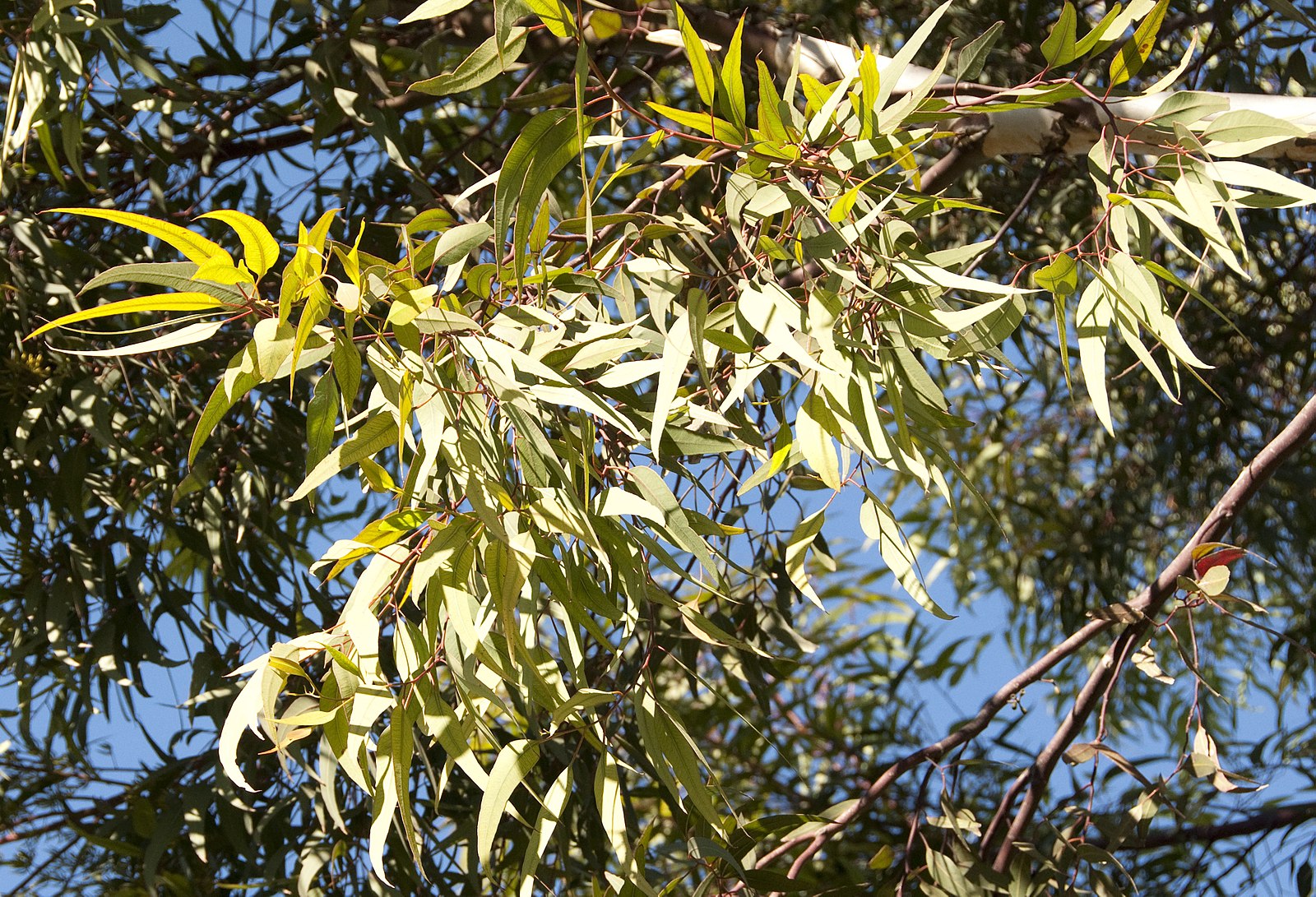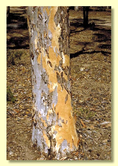 It has smooth white bark, often with patches of white, grey or light brown. Old layers of bark come off in flakes and it is not uncommon for a few flakes to persist on the trunk for a long time.