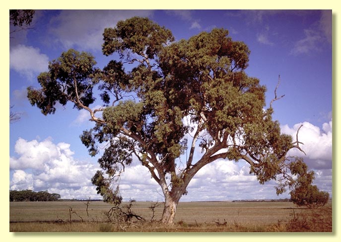 Eucalyptus wandoo is a tree that typically grow to a height of 25 m (82 ft) and forms a lignotuber.