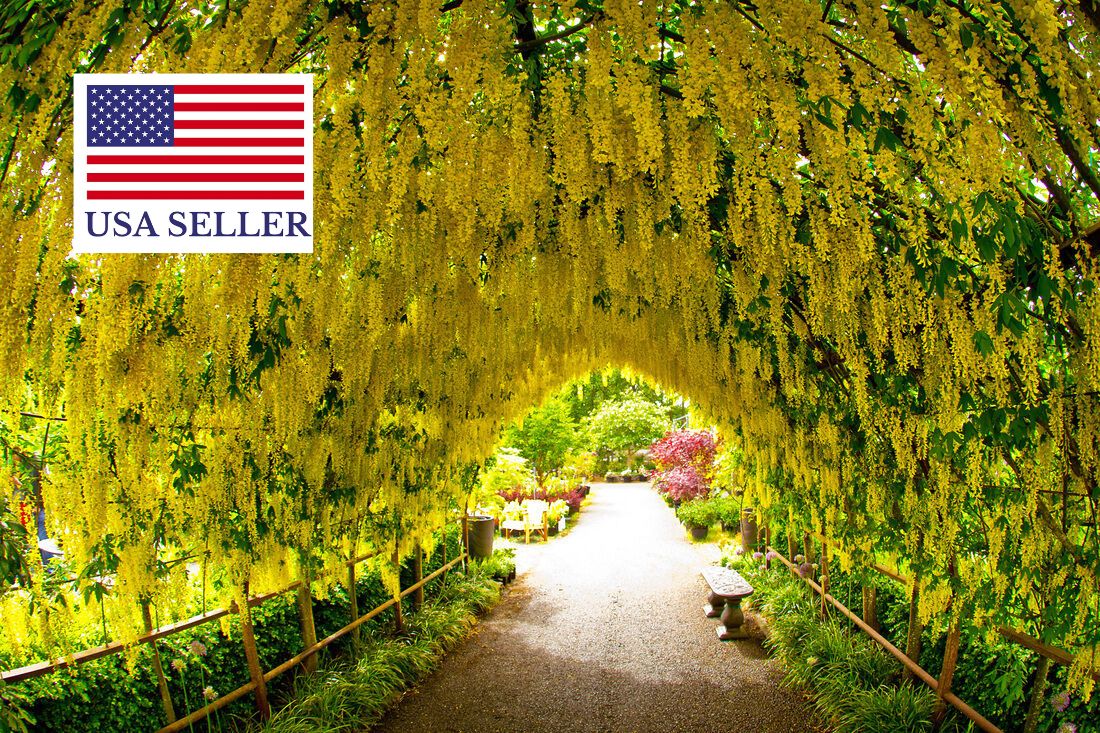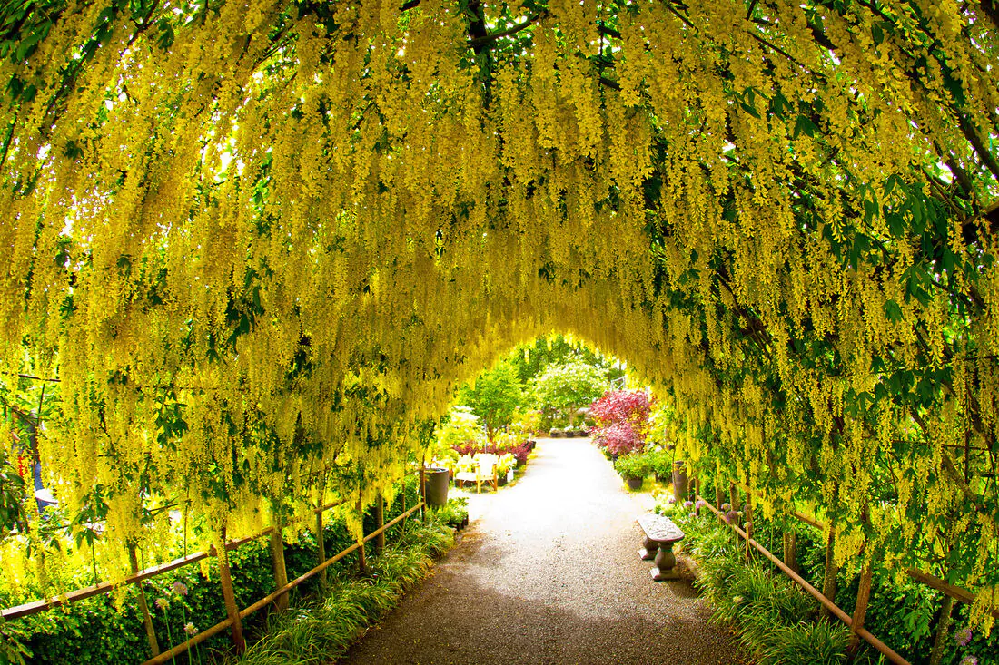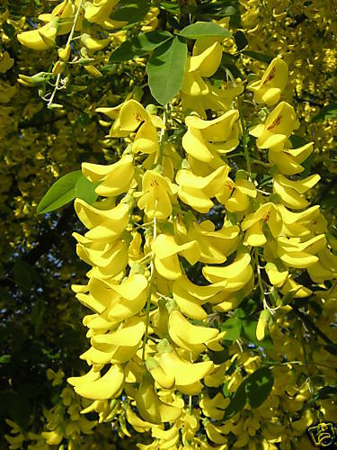 One of the best flowering trees for cold temperate climates, Laburnum anagyroides is a fast growing but short-lived, deciduous small tree or large shrub to 7 m tall with tripartite leaves and masses of long, pendulous racemes of bright yellow, sweetly scented flowers. It is native to central and southern Europe. All parts of the plant are toxic to humans and some other mammals.