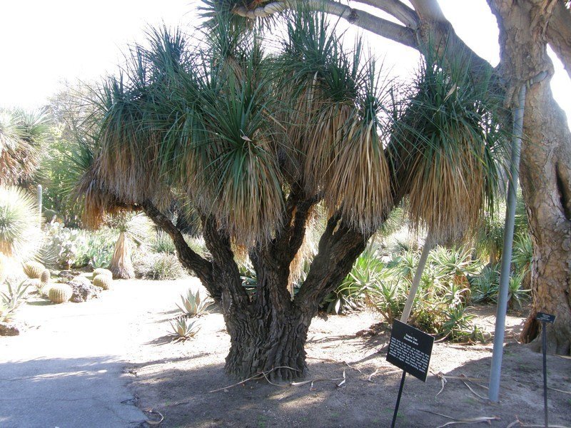 Similar to the common Pony Tail, Beaucarnea recurvata, this plant from Puebla and Oaxaca in Mexico develops long, straplike leaves that can reach a length of about 2 m (7 ft.) in mature plants. They are held in a solitary crown atop a sturdy trunk with a large base. As a young plant it can be kept as a robust indoor plant, when older, it attains dramatic, treelike dimensions and will grow well in the warm temperate garden.