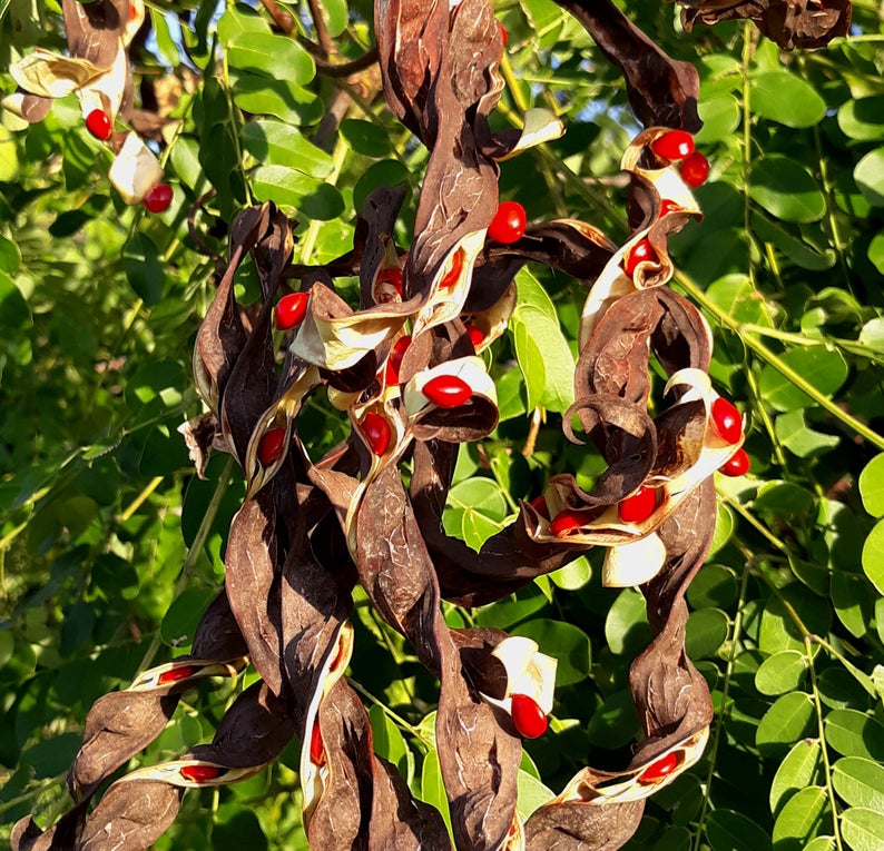 The tree bears feathery, bipinnate leaves and produces clusters of small, yellowish fragrant flowers. These are followed by distinctive curved, dark brown pods that twist open when mature to reveal brilliant red, glossy seeds, often used as beads or ornaments due to their vibrant color and uniform size.