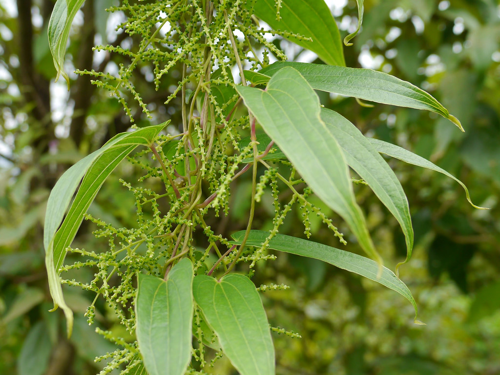 Cinnamon Vine is a deciduous perennial creeping and climbing vine, that may reach up to 16 feet in height given support from trees and shrubs. Although it is native to India, it is mistakenly called Chinese Yam. The vines twine from left to right. The leaves are pointed to long-pointed with a heart-shaped base. Leaves can be alternate or opposite in arrangement on the stem. Typically, leaves are 1.5-3 inches long and up to 1.5 inches wide with 7-9 veins. The margins, leaf-stalk and stems are purplish to red in color. The small yellowish-white flowers arise from the axils of the leaves. The flowers are bell-shaped and the male flowers are in bundles, spikes or panicles at the end of the branches. Flowers may have a spicy fragrance similar to cinnamon. Arrangement may be paniculate or spicate. Bulbils or small aerial tubers are produced in the axils of the leaves.
